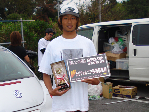 | 第29回 ALPHA CUP は、皆様のご協賛、ご協力のお陰をもちまして無事終了することが出来ました。 前日、波が無いとの情報で開催が心配されましたが当日の天候はくもり、波はヒザ〜腰セット胸サイズ、ちょっと早めのブレークながら一日中風も無く、まずまずのコンディションで無事開催することが出来ました。 ご報告と御礼申し上げます。 ご協賛、ご協力 ありがとうございました。 2010年11月14日(日) 千葉県南房総和田町(通称花かごポイント) |