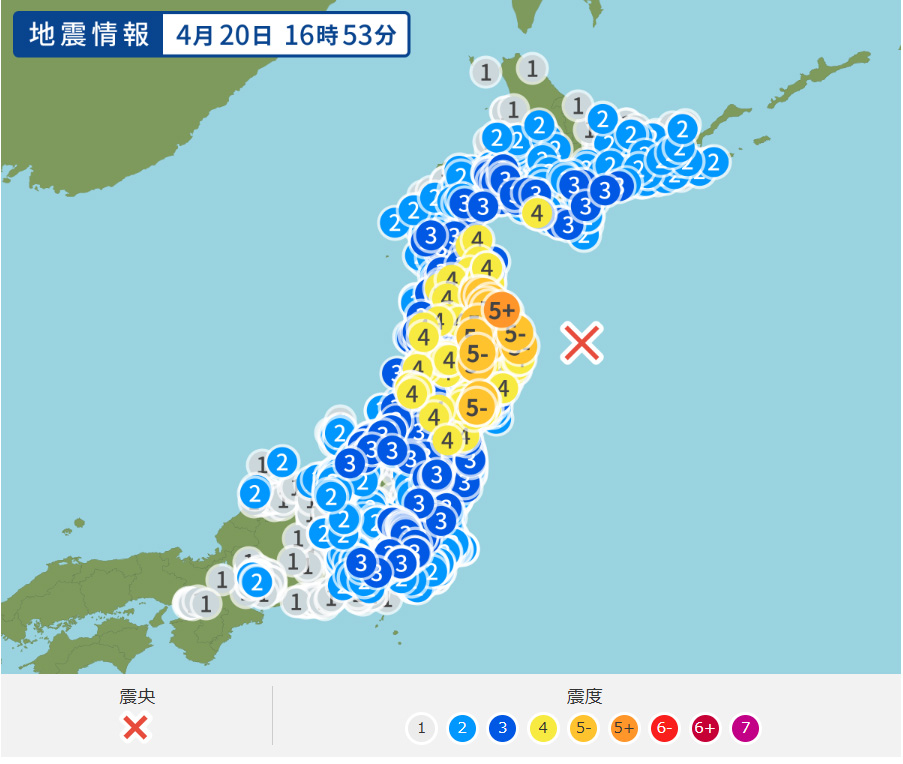 気象庁によると、20日午後4時53分ごろ、次の地域で震度5強の地震が・・・