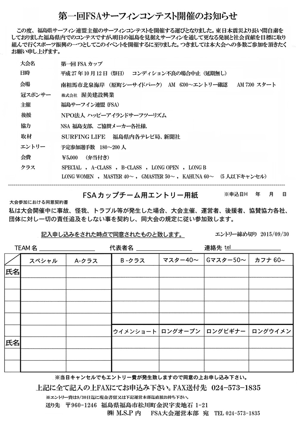 震災後FSUの復興大会を長く控えておりましたが皆様のご理解とご協力を得ることが出来まして開催に至りました。これを機会に新たな福島のサーフシーンを盛り上げて行きたいと思いますので皆様のご参加をお願いする次第です。皆様お誘い合わせの上ご来場下さいますよう宜しくお願い申し上げます。